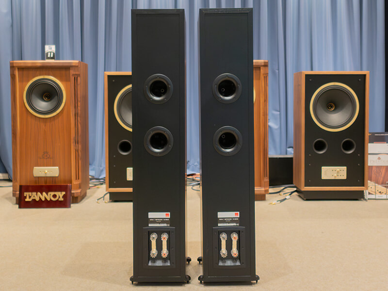 周波数特性は49Hz~30kHz、感度88dB、推奨アンプ出力は25~200W。外形寸法(スパイク含まず)は高さ1,001mm × 幅195mm × 奥行330mm、重量は1本あたり18.7kgとなります。